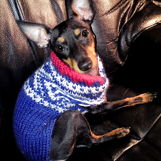 Mønsteret er selvkomponert og laget i Alpakka siden hun har litt lite pels og ull klør :O)).Det er sønnen som eier hunden og hun er Norgesvinner 2010. Det er "bestemors" lille gull, Amy.